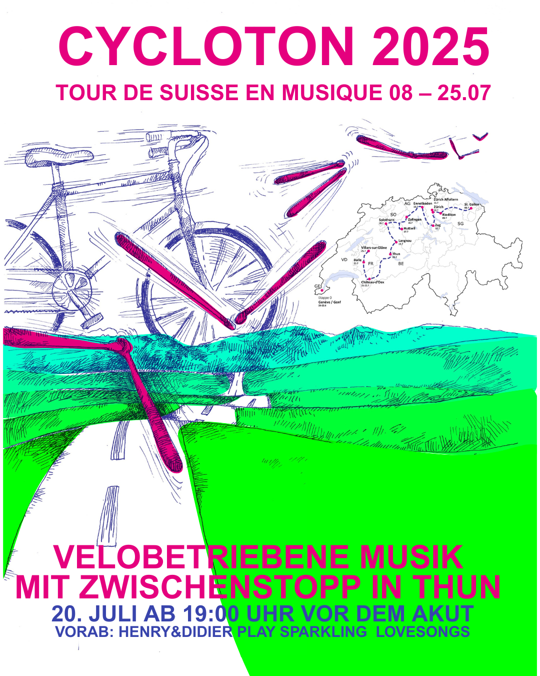 Das Cycloton – Tour de Suisse im Musik – ist dieses Jahr wieder da und macht am Sonntag, 20. Juli einen Zwischenstopp im AKuT! Als ökologisches und familienfreundliches Festival außerhalb der Stadtmauern hat das Projekt zum Ziel, die Bevölkerung in all ihrer Vielfalt durch die Musik wieder miteinander zu verbinden. Die Karawane des Cycloton bewegt sich fort, indem sie das gesamte Material mit dem Fahrrad transportiert. Vor Ort liefern die beiden Fahrräder, die das Material transportiert haben, den Strom für die Musikanlage.