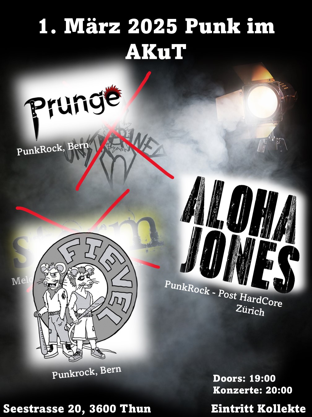Ihr könnt euch trotzdem auf schöne Konzerte freuen: PunkRock-Post HardCore von Aloha Jones, und neu gibts auch noch Punkrock von FIEVEL und Prunge